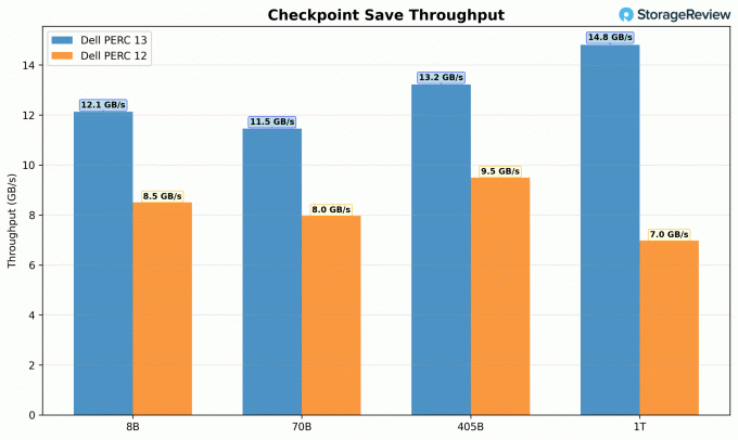 Porównanie czasu zapisu w punkcie kontrolnym wykazało, że kontroler Dell PERC13 konsekwentnie przewyższał PERC12 we wszystkich konfiguracjach modeli. PERC 13 uzyskał czas zapisu w zakresie od 7,61 do 10,17 sekundy, podczas gdy PERC12 potrzebował od 10,41 do 20,67 sekundy dla tych samych operacji. Różnica w wydajności była najbardziej wyraźna w przypadku modelu parametrów 1T, w którym PERC13 zapisywał dane w nieco ponad 10 sekund w porównaniu z ponad 20 sekundami w przypadku PERC12. Oznacza to około 50% redukcję czasu oszczędzania w przypadku największych modeli.